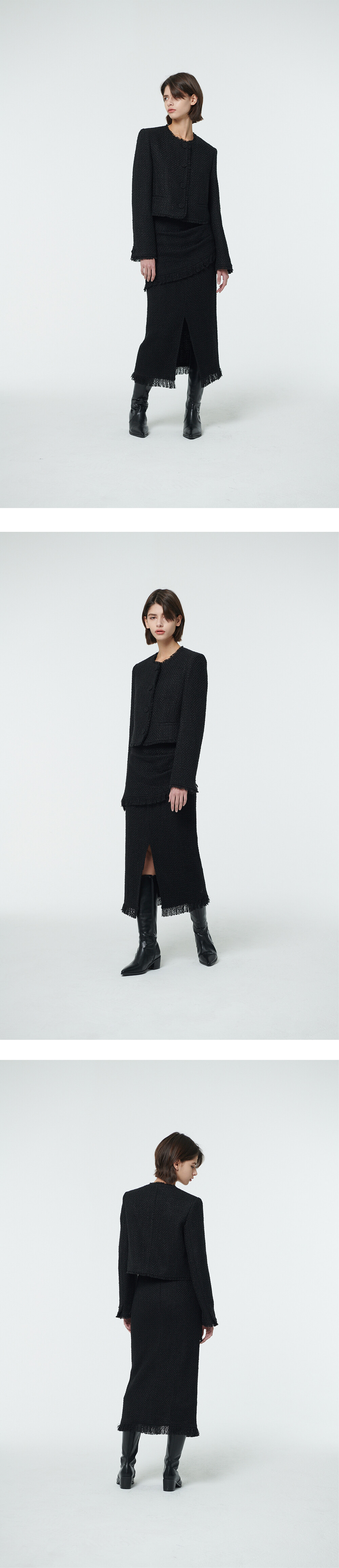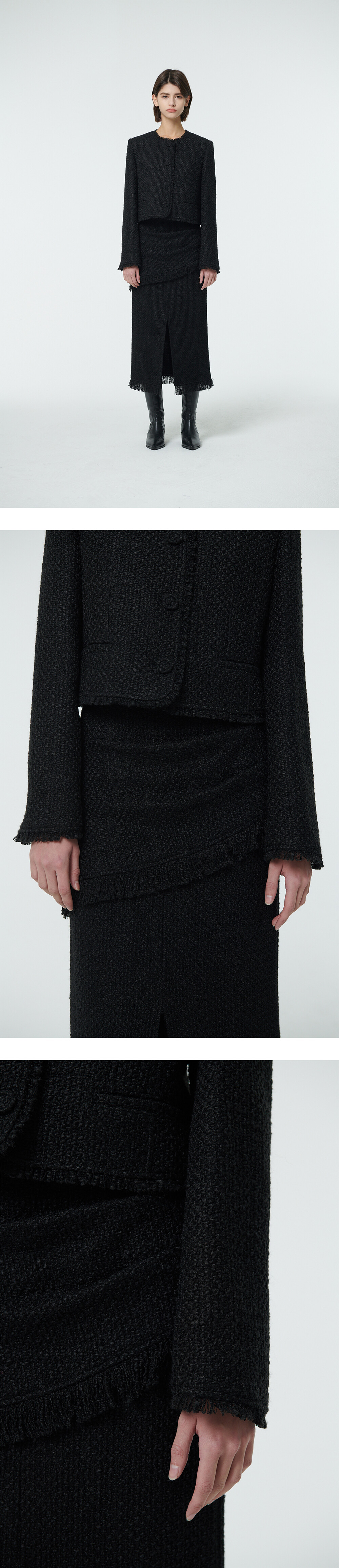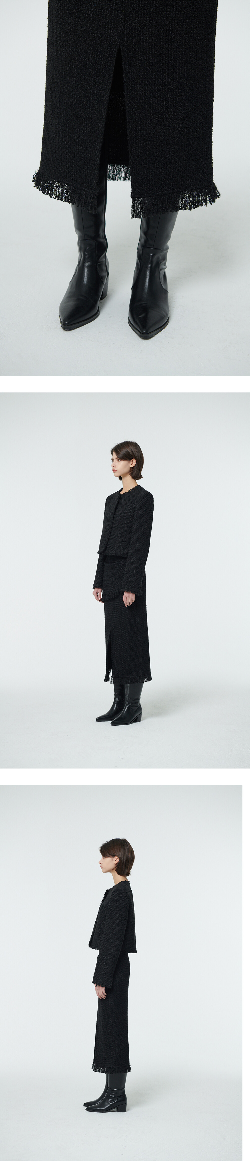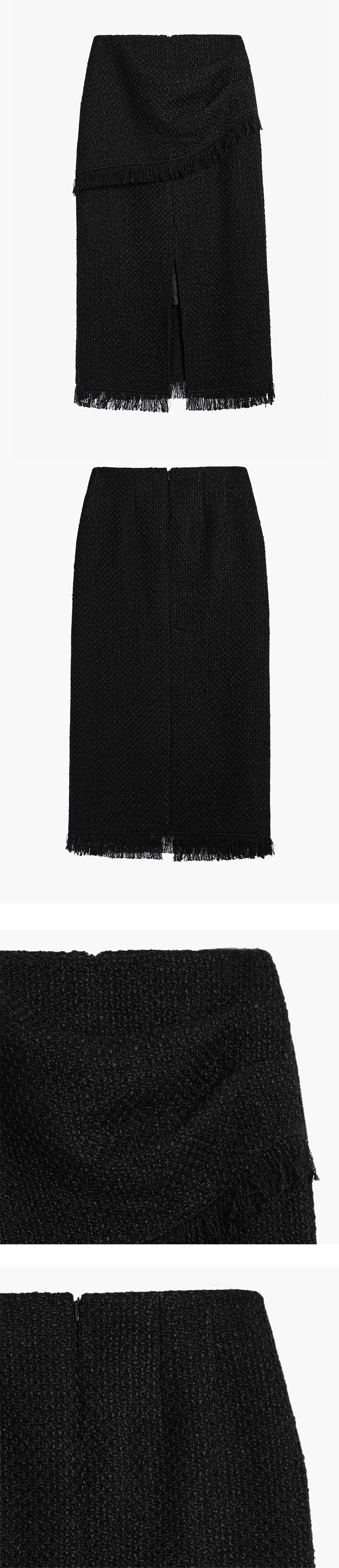 한 올씩 수작업으로 풀어낸 프린지 디테일과 패브릭의 독특한 조직감프린지 이중 덮개로 볼륨있는 실루엣이 매력적인 트위드 스커트입니다.